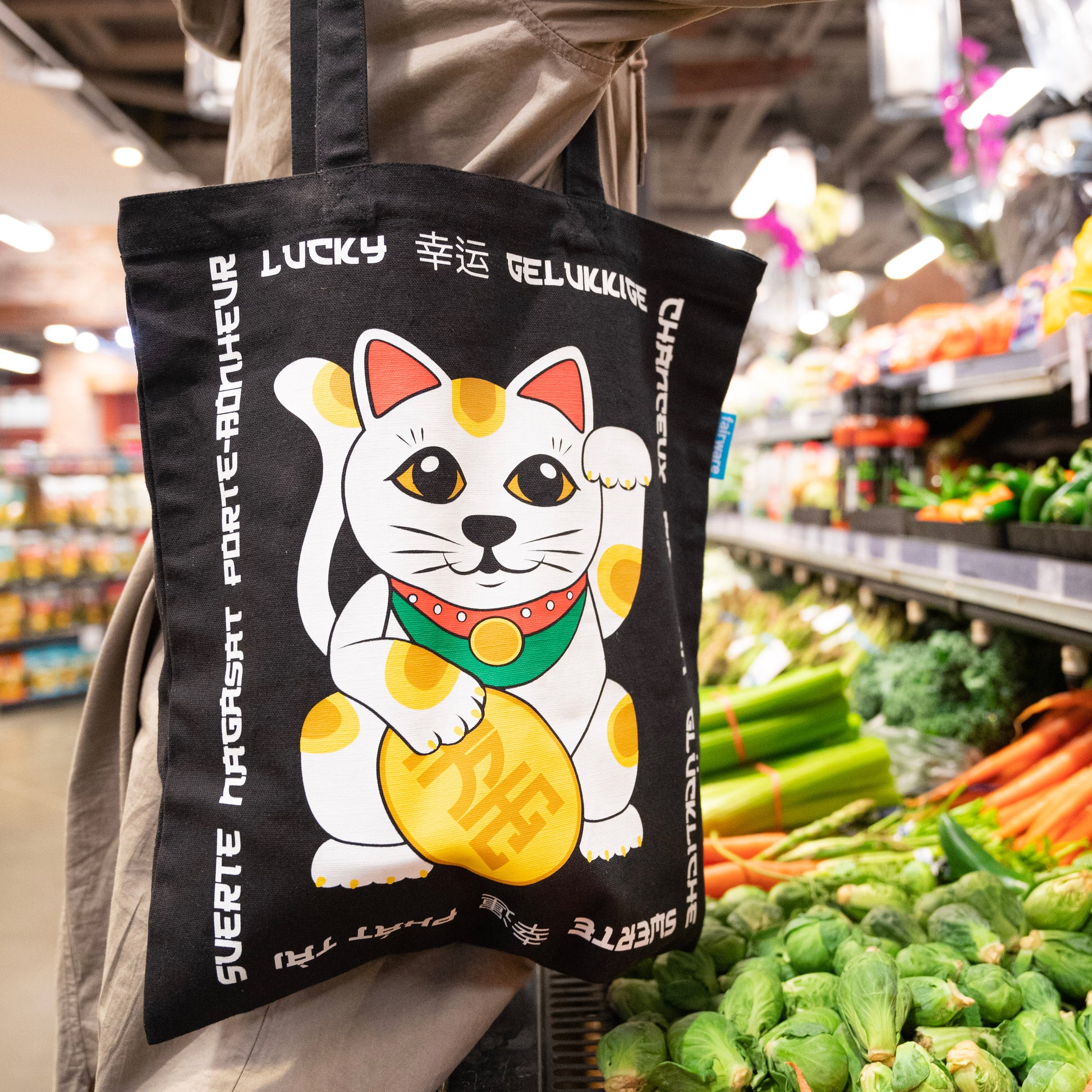 The Lucky Cat tote bags are made in India from 100% GOTS Fair Trade Certified organic cotton. They measure 15" x 17" and are printed on the front with a pinch label sewn into the side.